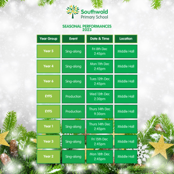 Dear Parents/Carers, you have been invited to attend our annual seasonal performance. Please make a note of the date and time for your child’s year group. We look forward to welcoming you!