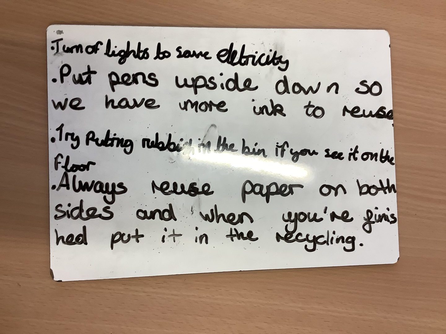Our Eco Team met today to create a list of top tips to share with their classes on how to make their classrooms more sustainable. They suggested simple but effective ideas, such as storing handwriting pens upside down to help save ink and keeping scrap paper to use both sides during wet play.