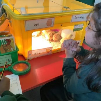 EYFS had special visitors in class, tiny, newborn chicks. They watched the eggs hatch and held and stroke them.