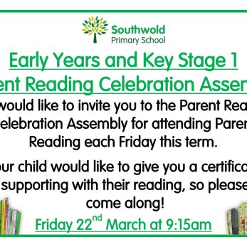We invite all EYFS and KS1 parents/carers on Friday 22nd March for our Parent Reading Celebration Assembly. This is an opportunity for us to thank you for attending all the coffee mornings held here at Southwold!