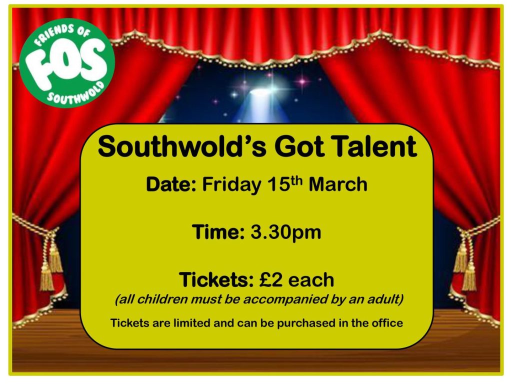Parents/Carers, Southwold's Got Talent will be on Friday 15th March. If you would like to attend, please pop by to the office and purchase a ticket for £2 per person.…