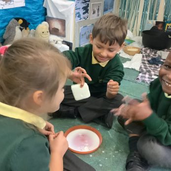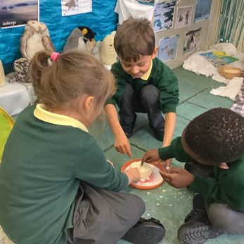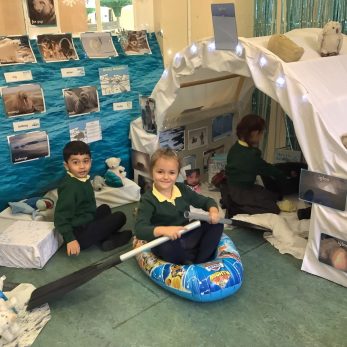 Children in reception are enjoying the new role play area – igloo! They are learning about Arctic animals and figuring out the best way of how to get to the North Pole. They have also looked at what will happen to the milk in freezing environment end explored frozen milk melting in the warm room.