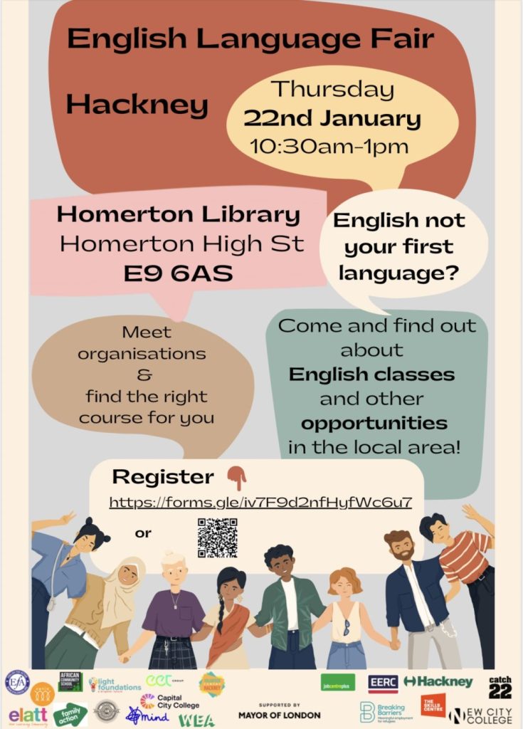 English not your first language? Meet local organisations next Thursday, 22nd January at 10:30am at Homerton Library, and find the right English course for you. See details on the poster.