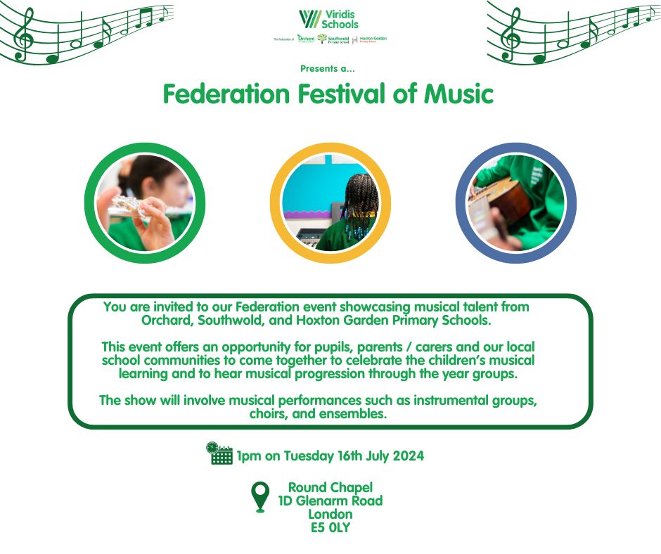 At the end of the Summer term, we held our first ever Viridis Federation Music Festival at Hackney Round Chapel. There were a range of musical talents on display, including a Samba Band, Orchestra and our Federation Choir. It was a fantastic success. All children have the chance to learn a musical instrument in our school, with some children also taking up the opportunity to have specialist lessons in the piano, guitar, drums, flute and violin. If you would like your child to benefit from learning an instrument, we subsidise the costs of lessons and can also lend instruments for practise at home free of charge. Please ask more in our school office or by emailing adminsouthwold@vs.hackney.sch.uk