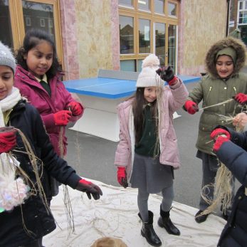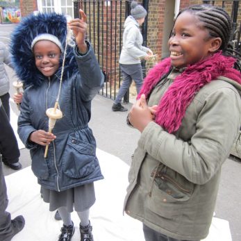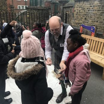 Year 4 children were learning how to scutch, heckle and spin their homegrown flax fibre into a ball of linen yarn that will then be knitted into a hat for our ‘flaxman”, who gets a new item of clothing every year. Pupils also learnt how Egyptian mummy bandages were made! Paul Henry – the spinner/ kilt maker has also been using some homegrown school madder from our dye garden to dye some wool to show the range of colours you can get from this one plant.