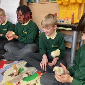 Year 6 enjoyed holding Reception’s newly-born chicks, listing the features of the furry new animals.